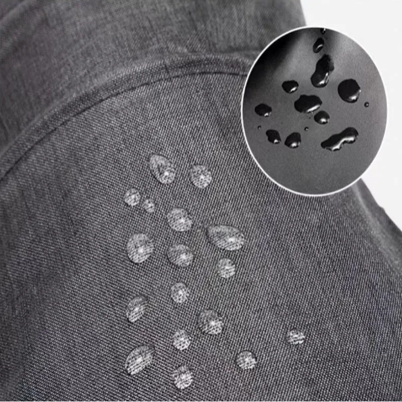 Waterproof fabric produces lotus leaf effect to bounce off water drops and slide down.