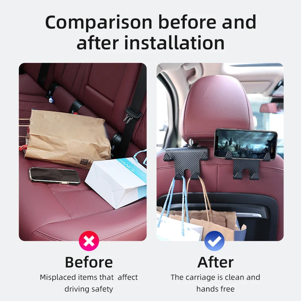 1. Newly upgraded multi-functional hanging hook for car hang 2 shopping bags and hold a phone at the same time to keep the interior clean and tidy.