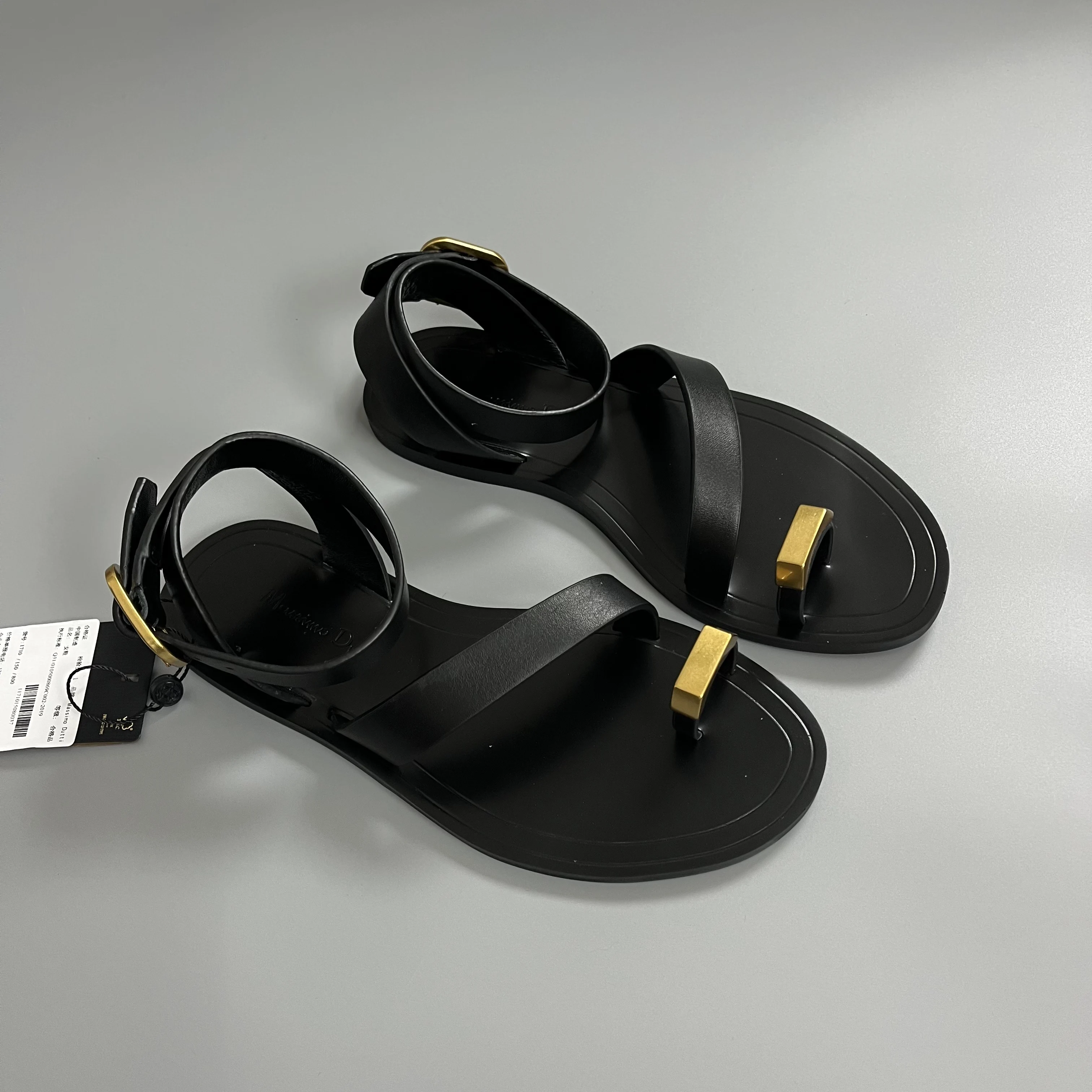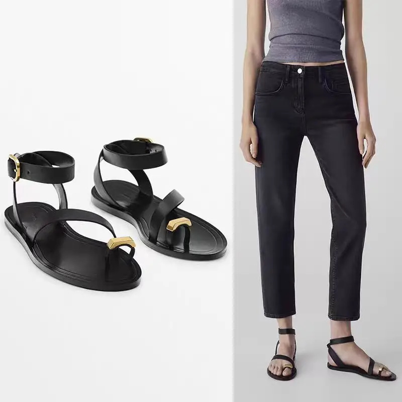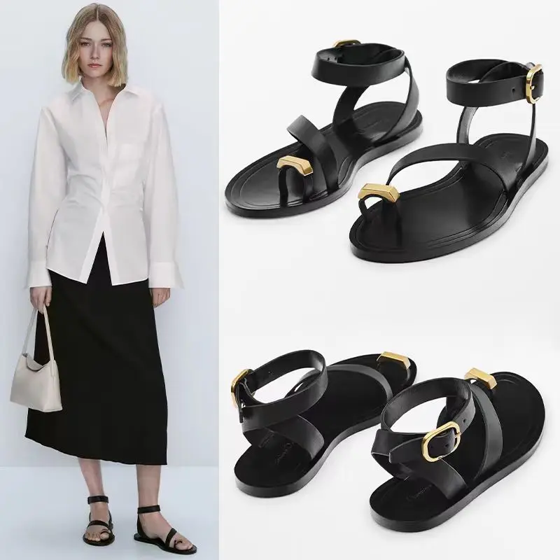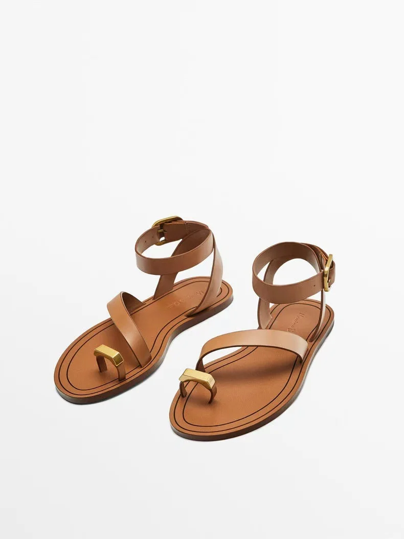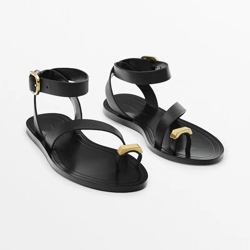 Women's Beach Sandals Genuine Leather Flat Clip Toe Metal Decoration Stylish Sandals Comfortable Versatile For Summer And Autumn