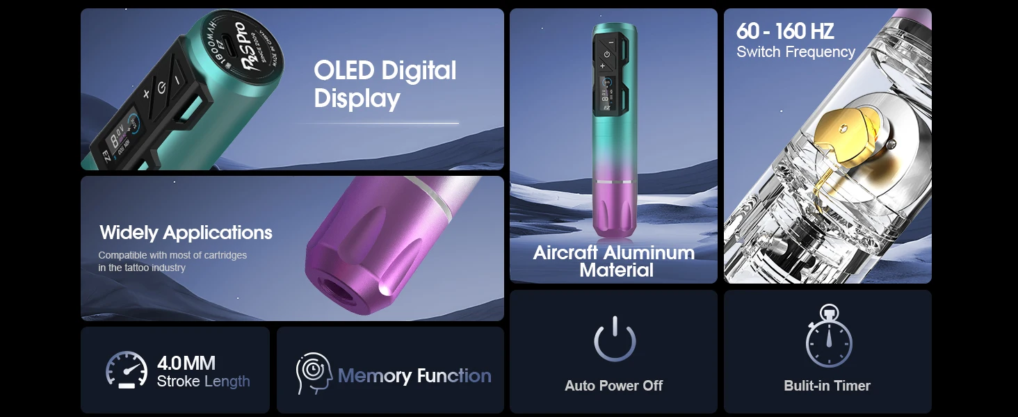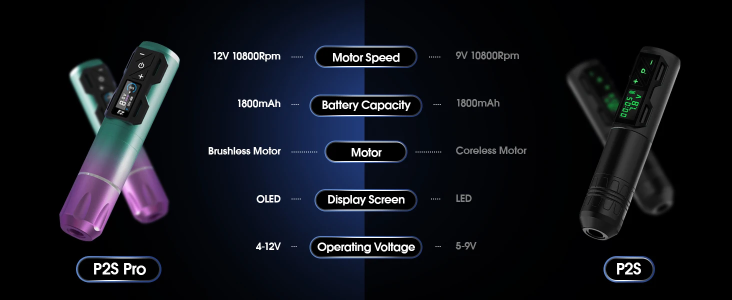 P2S Pro wireless tattoo machine pen has visible OLED screen shows operating voltage and remaining power, battery capacity is 1800mAh. 4V-12V adjustable voltage, can support long-term tattoo work, output stable, designed for tattoo artist or beginner.