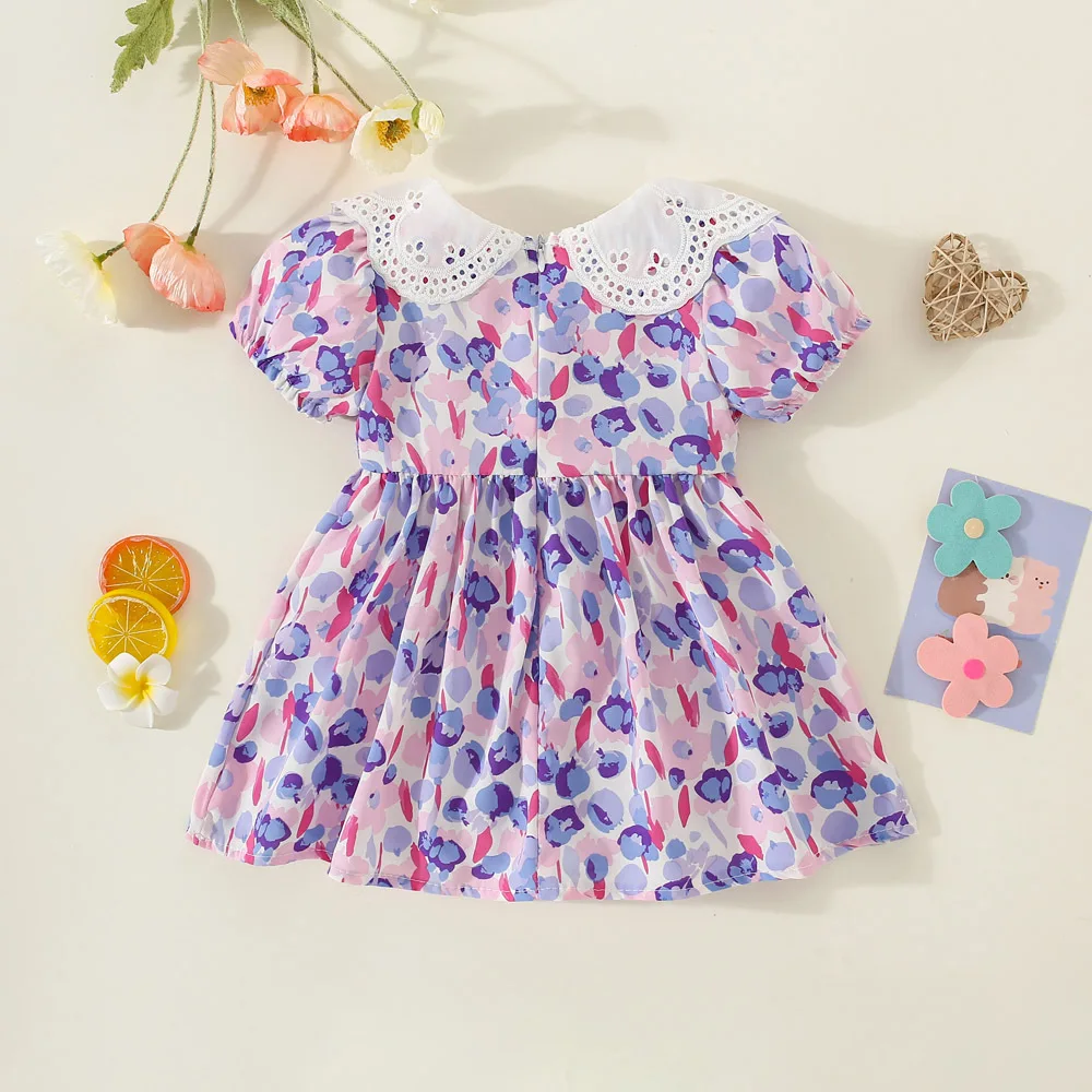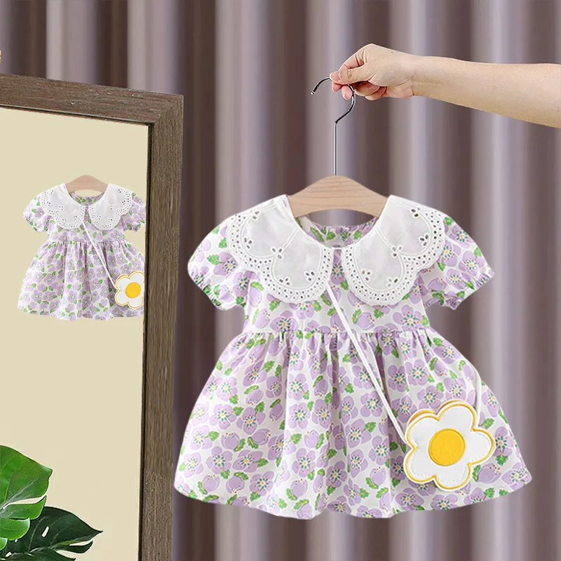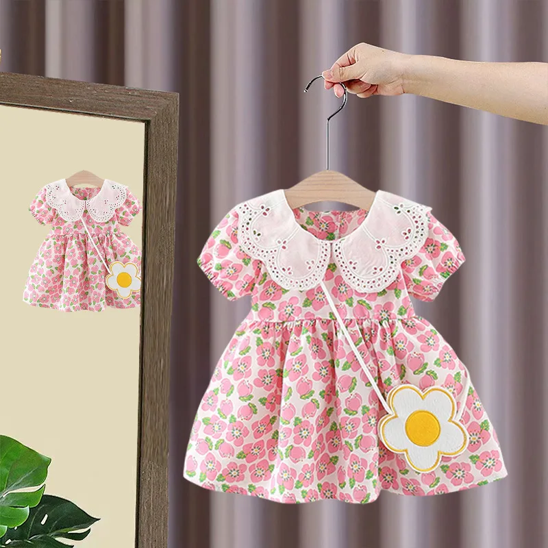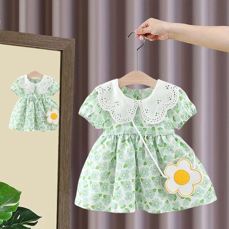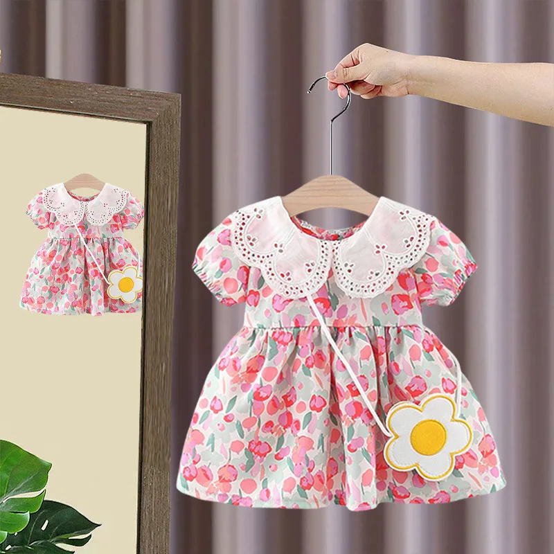 Baby Children's Summer New Doll Neck Lace Panel Printed Dress Children's Short Sleeve Full Print Princess Dress and Bag
