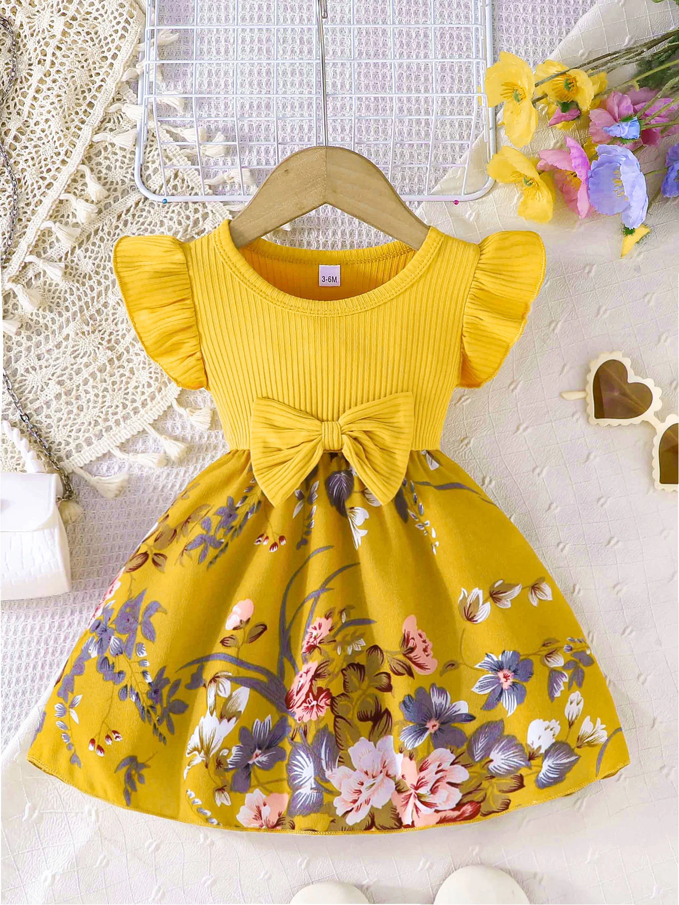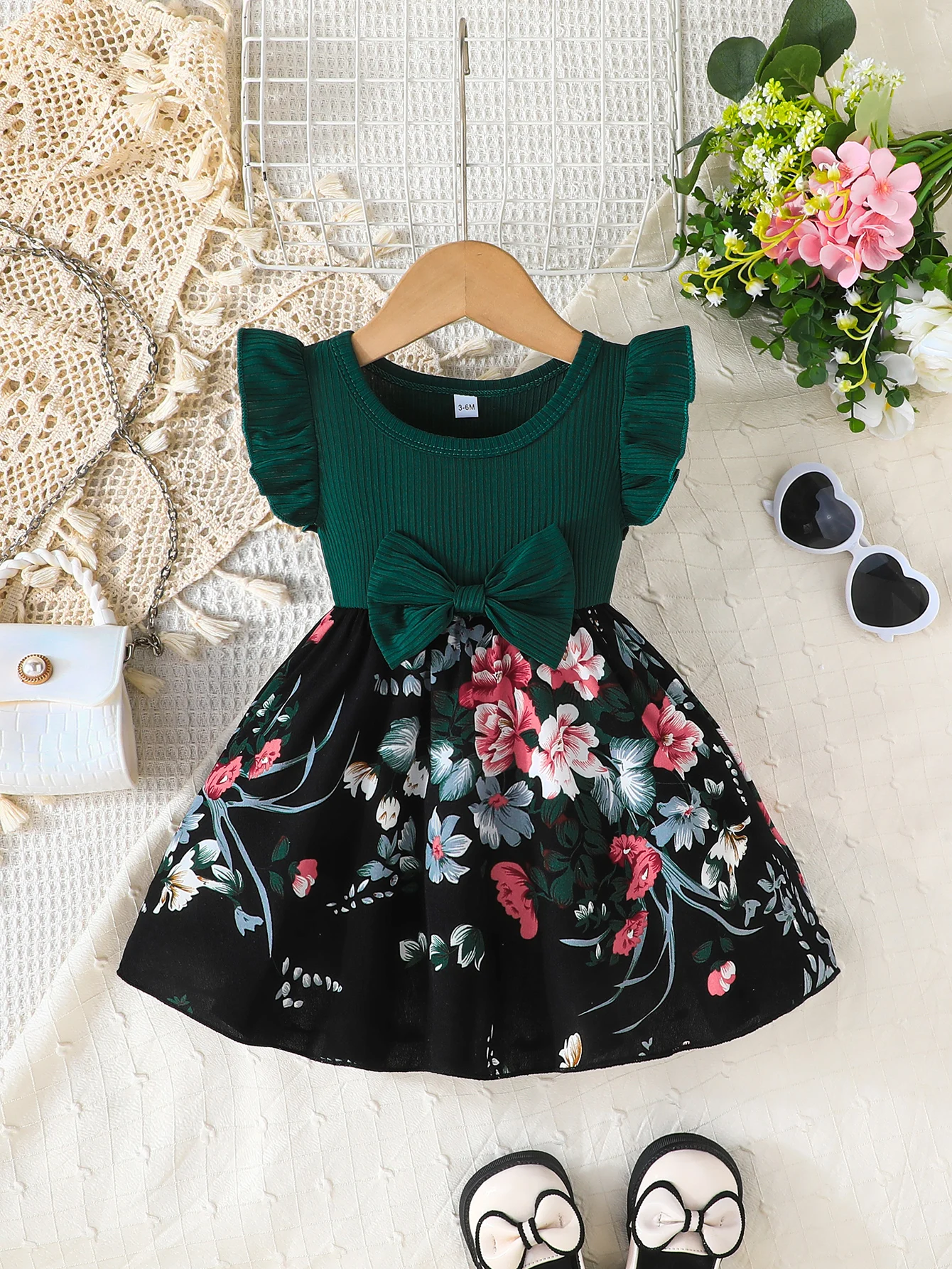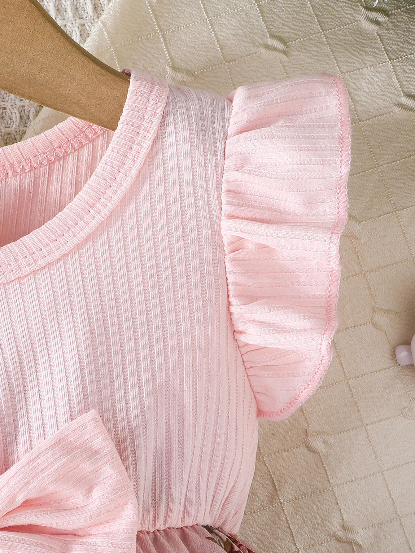 Ribbed flying sleeve top with floral skirt and large bow, super eye-catching girls' sweet style dress!