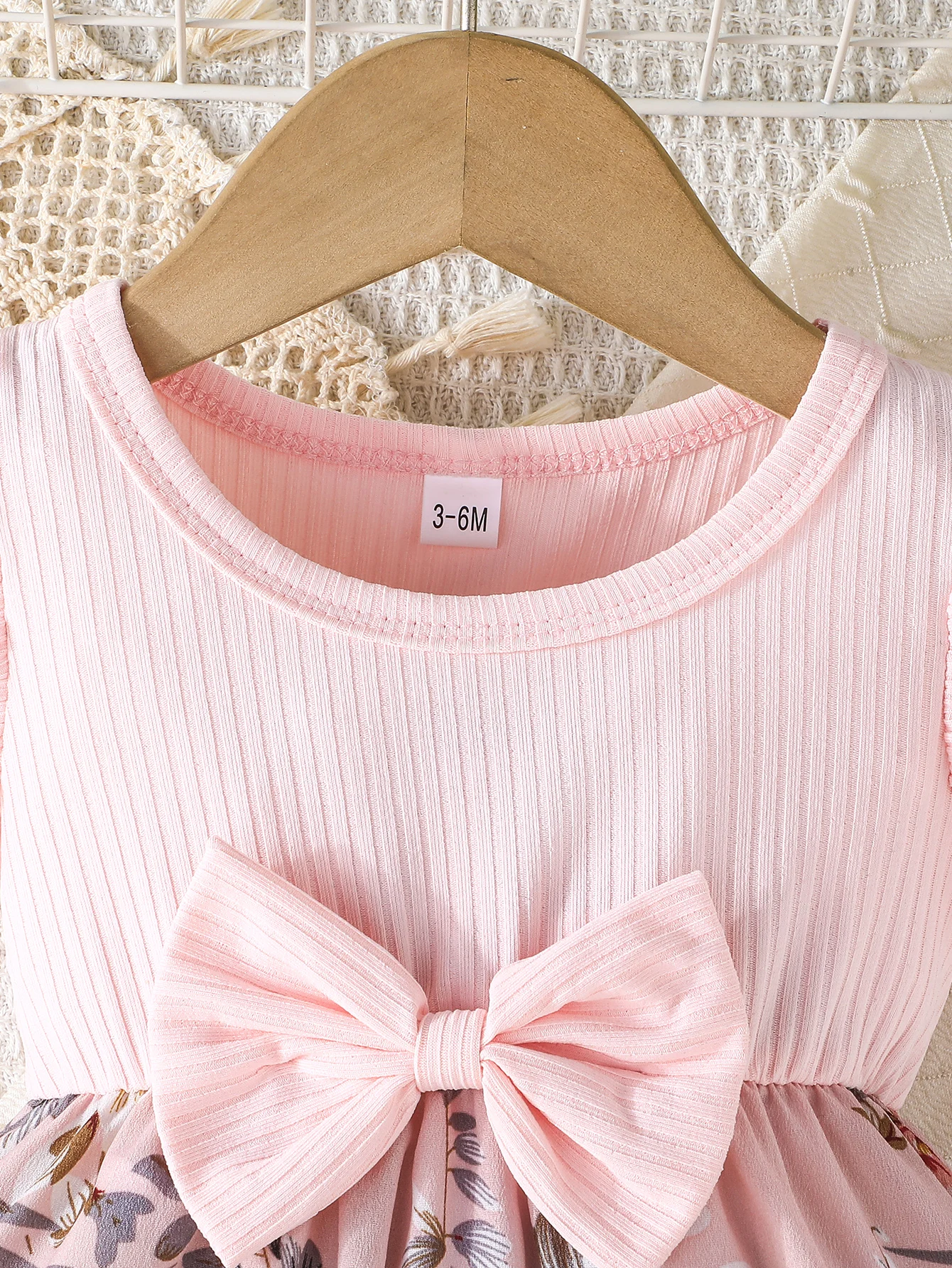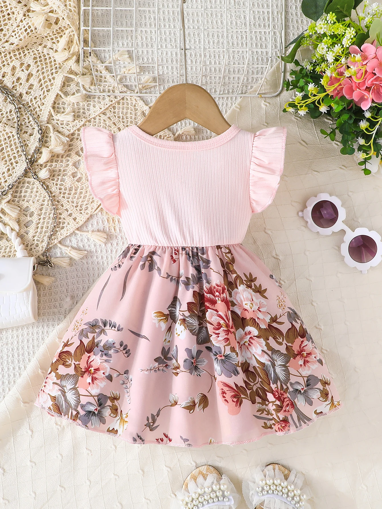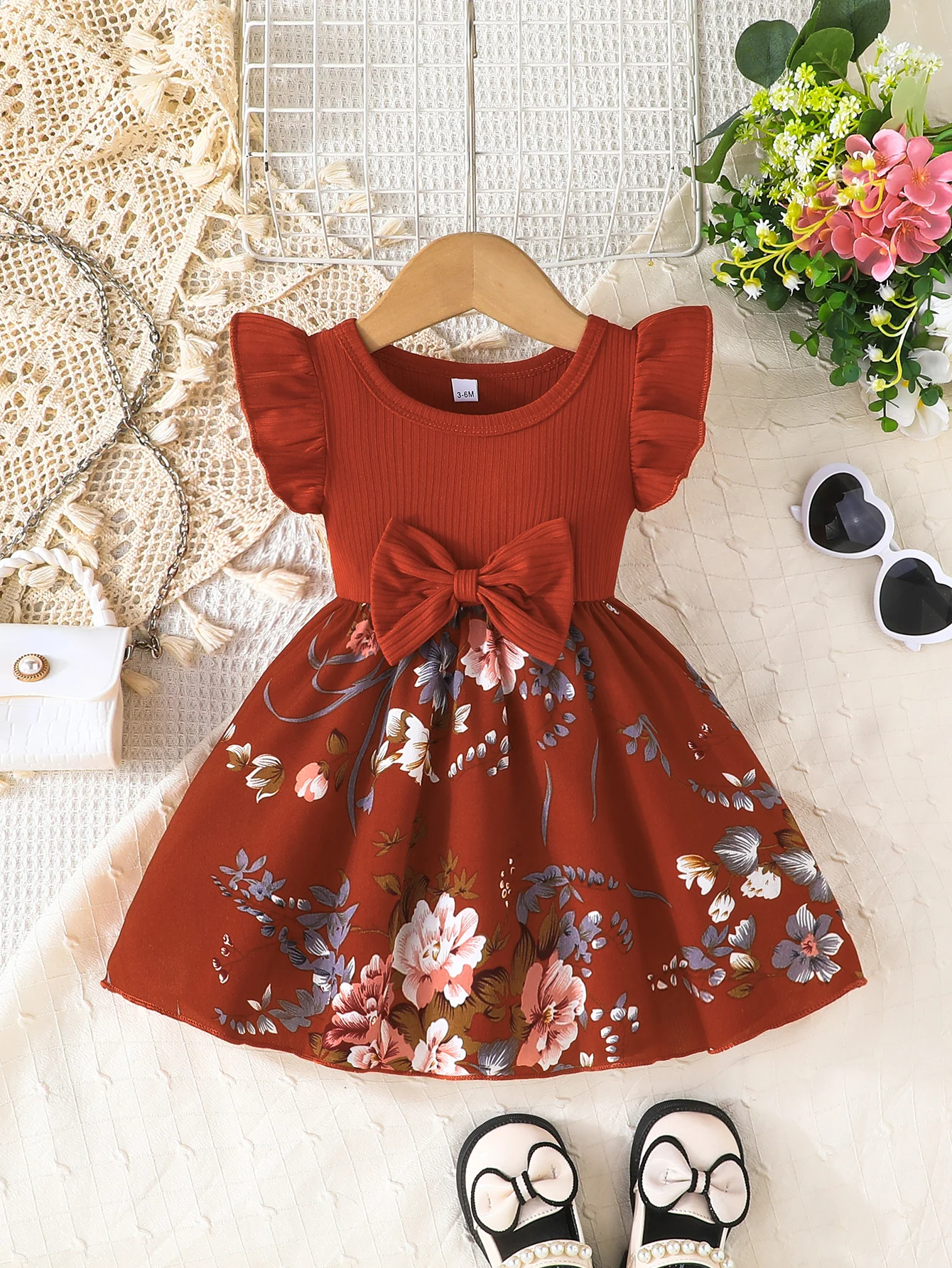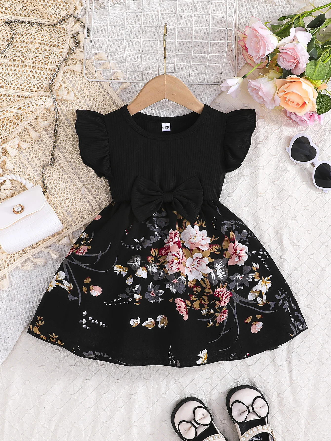 Ribbed flying sleeve top with floral skirt and large bow, super eye-catching girls' sweet style dress!