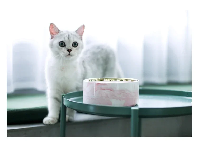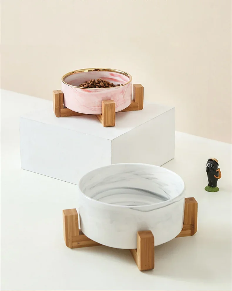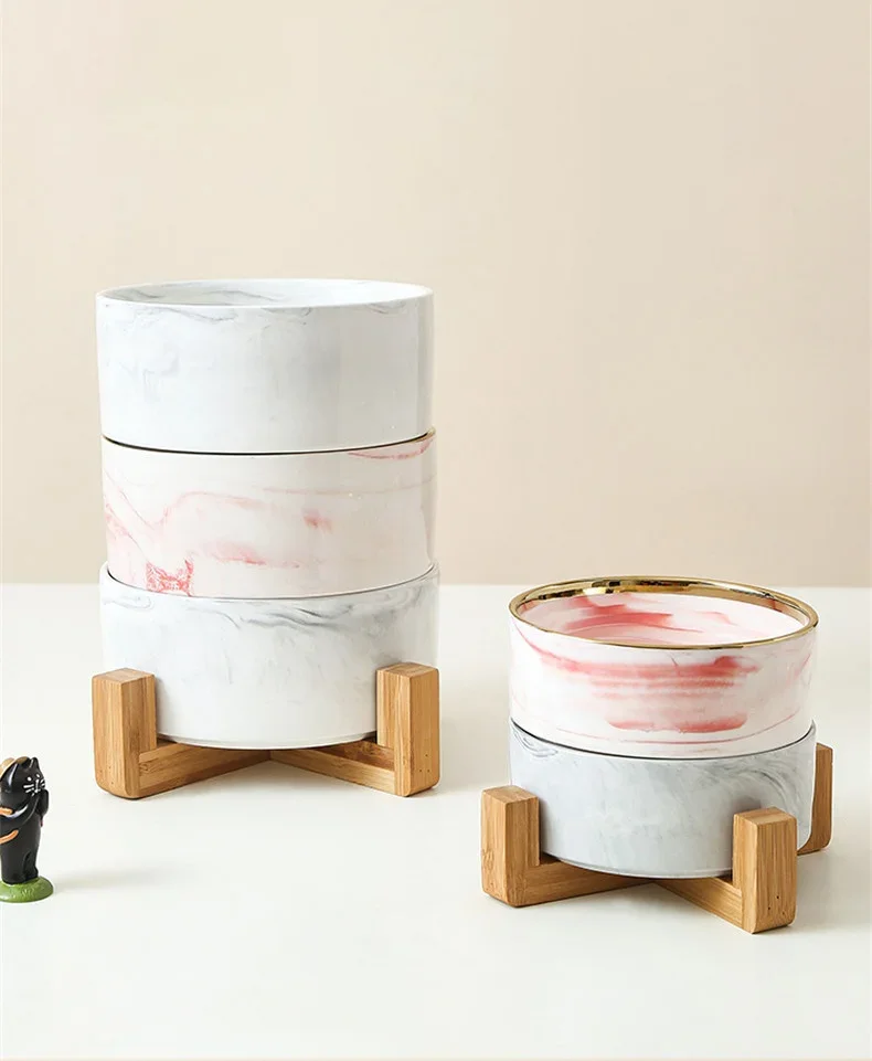 Pet Bowl Cat Bowl with Wooden Frame Cat Neck Protection Bowl Drinking Bowl Marble Double Bowl Pet Supplies