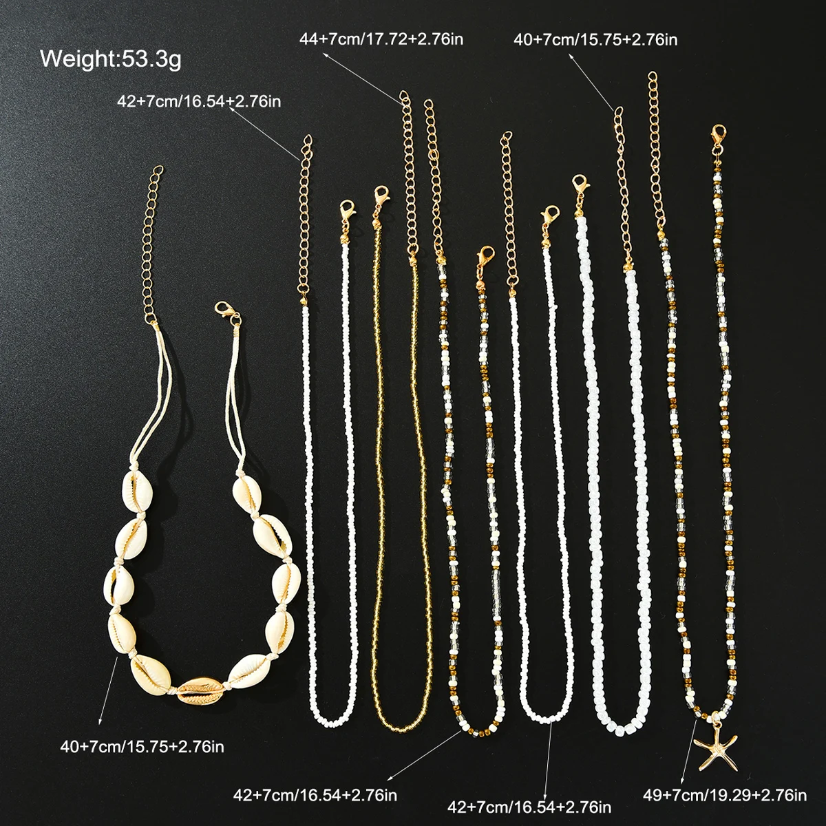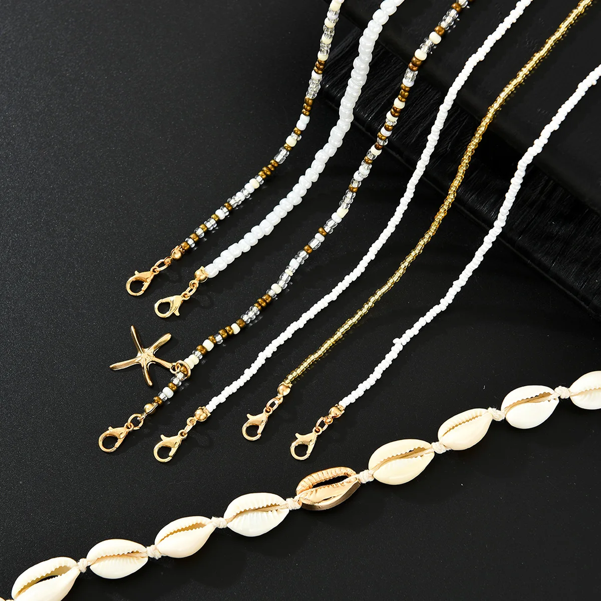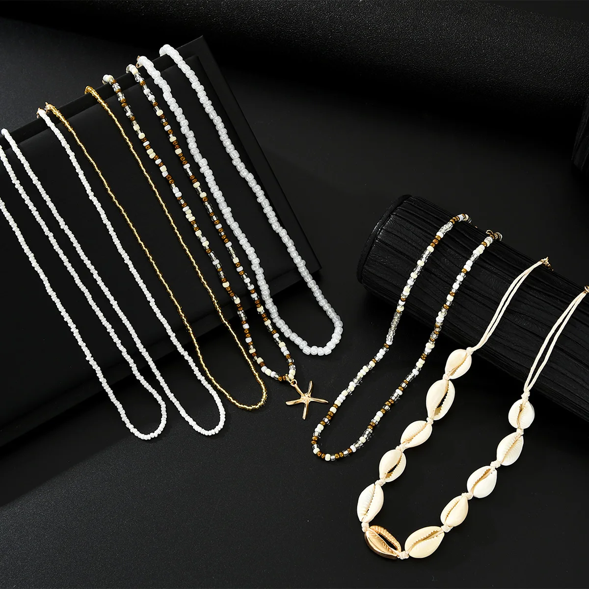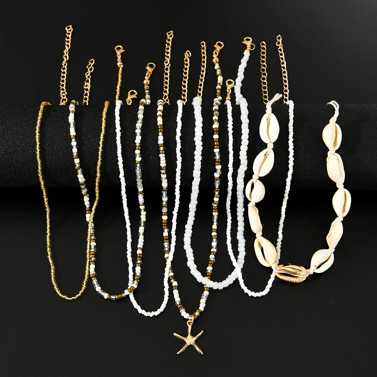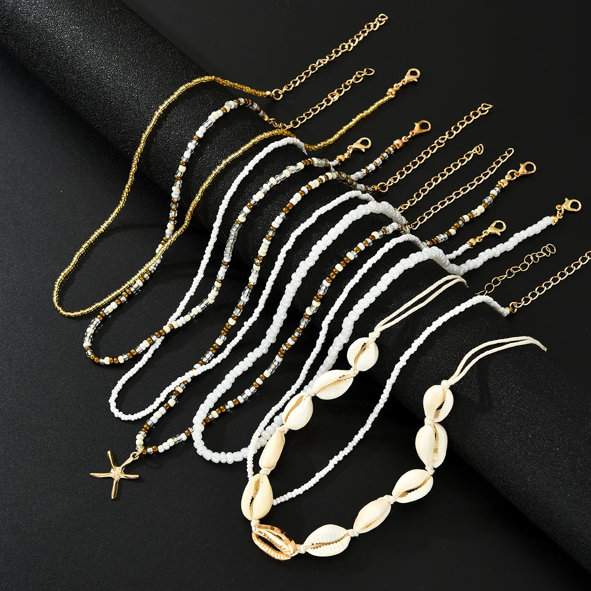 7Pcs/Set Boho Starfish Conch Rice Beads Pendant Necklace for Women Fashion White Color Multi layered Necklace Set Summer Jewelry