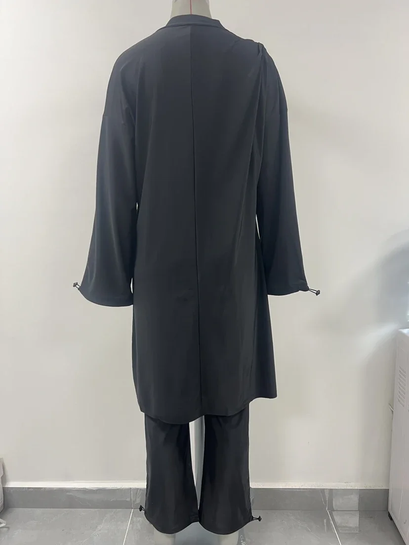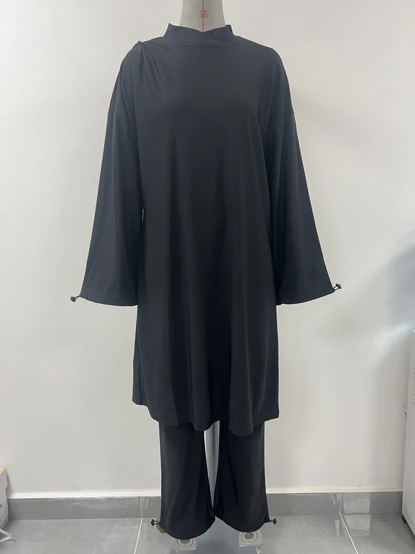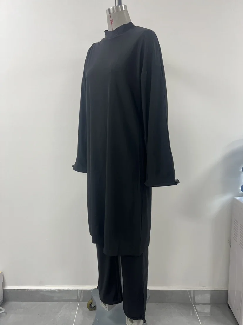 The tunic falls to a length that provides ample coverage. Paired with it are matching trousers that offer a streamlined and comfortable fit. The entire ensemble is crafted from a smooth, flowing fabric in a classic black color, which not only enhances the sense of modesty but also gives it a timeless and versatile appeal. This burkini is perfect for those seeking both fashion - forward style and religious or personal modesty requirements.