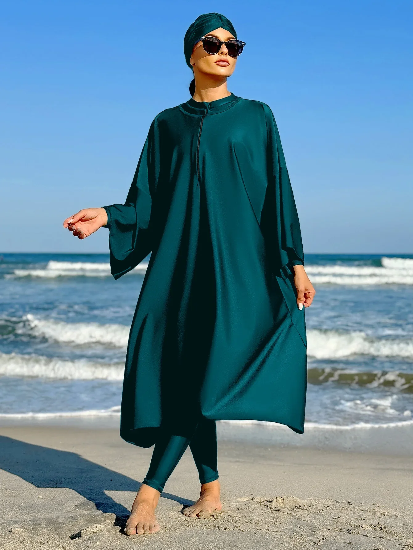 1.女士布基尼泳装:3 件(长袖布基尼包括长袖泳袍、连体泳衣和头巾)。穆斯林泳装是一种实用、时尚、朴素的泳装,帮助您享受阳光,在海滩和游泳池附近玩乐。舒适的面料搭配套头款式,易于穿脱。搭配卡普里全长裤和泳帽,在你进出水时都能得到保护!修身泳裤,带安全拉链,可固定在上半身泳衣上,