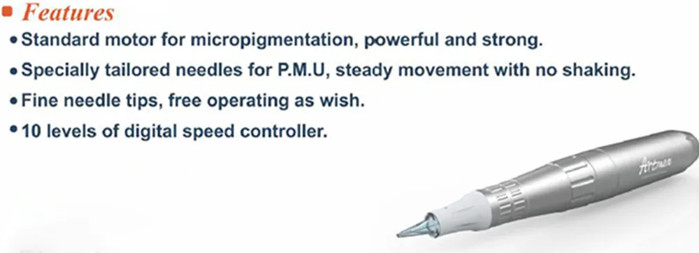 - Preset needle frequency for specific procedure, i.e. eyebrows, eyeliners, lips semi permanent makeup procedures